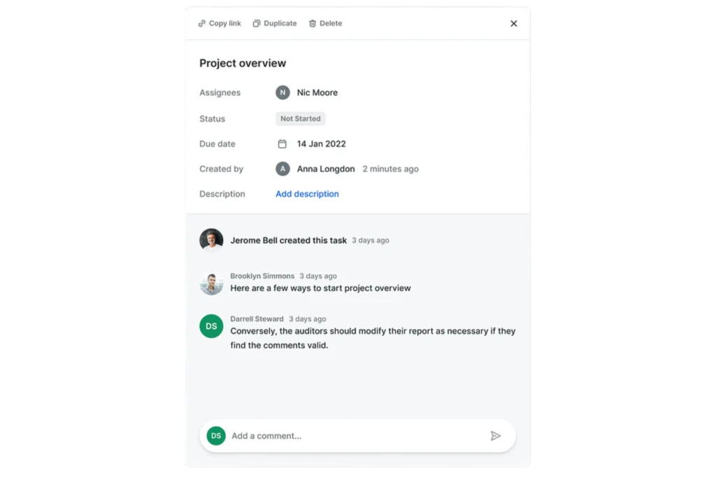 - Collaborative Workspace: Engage with team members directly on task-related matters.